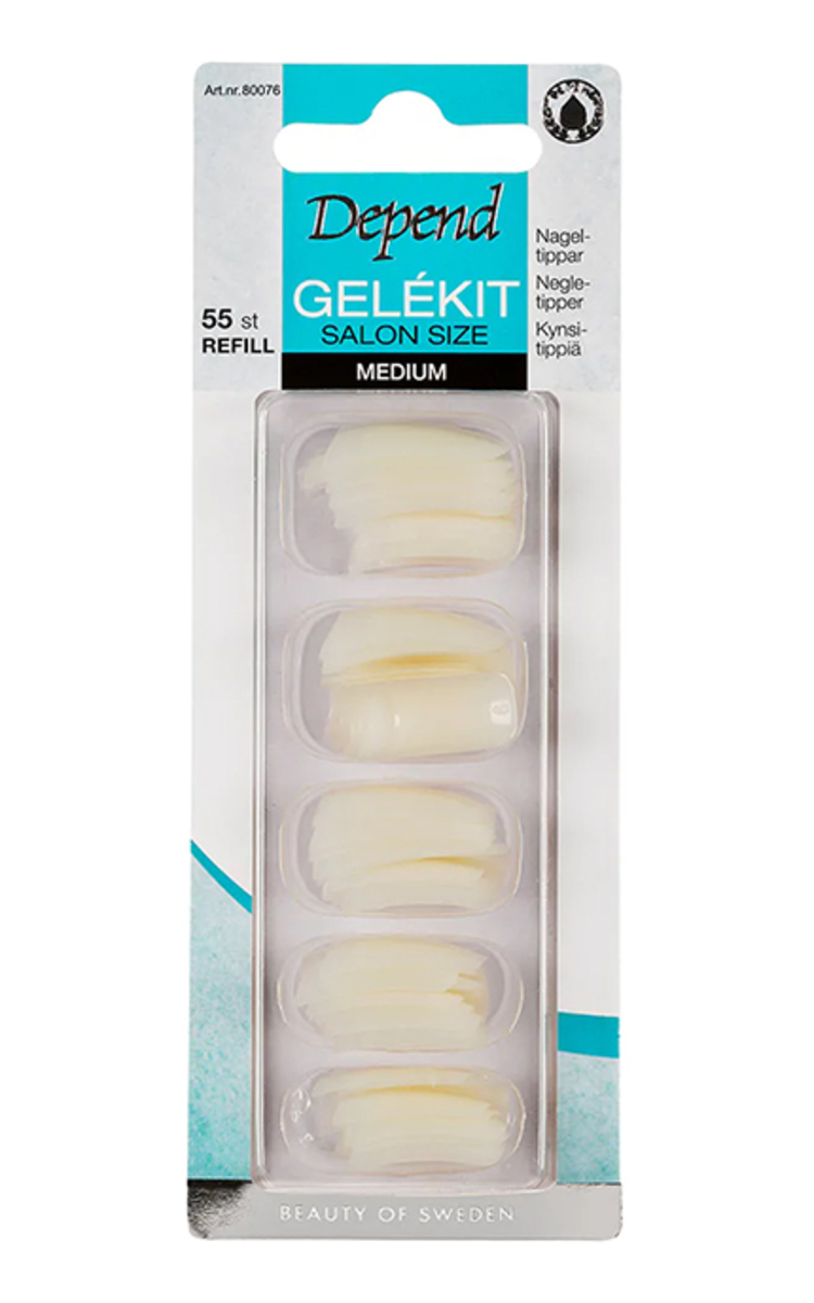 NAUDOJIMAS: 1. Atlikite manikiūrą. Pradėkite nuo nagų šlifavimo dilde ir jų formavimo. Švelniai pastumkite odeles. Naudokite poliravimo dildę, kad išlygintumėte nagų paviršių. Patarimas! Odelių šveitikliu pašalinkite visas negyvas odos ląsteles išilgai odelės ir nagų, kad jūsų dirbtiniai nagai ilgiau išsilaikytų. 2. Nuvalykite nagus lako šalinimo priemone be acetono ir aliejaus. Rekomenduojame naudoti Depend mėlyną nagų lako šalinimo priemonę. Palaukite, kol nagai išdžius. 3. Užtepkite ploną sluoksnį Depend nagų klijų ant nago jungiamojo paviršiaus, kuris yra plona dalis antgalio gale. Dėmesio! Netepkite klijų per visą antgalį. Pridėkite ir prispauskite antgalius, tvirtai laikykite 5-10 sekundžių. Jei naudojate Shortcut antgalį, nenulaužkite galiuko prieš klijavimą. Nagų nuėmimas: naudokite Depend dirbtinių nagų nuėmimo priemonę. Niekada nelaužkite ir netraukite nago, nes tai gali pažeisti natūralų nagą.