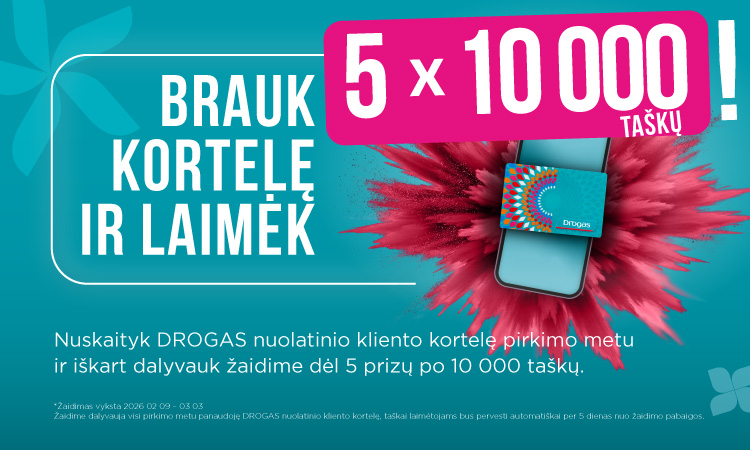 Nuskaityk DROGAS nuolatinio kliento kortelę pirkimo metu ir iškart dalyvauk loterijoje dėl 5 prizų po 10 000 taškų.