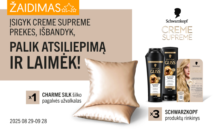 2025 08 29-09 28 konkurse SCHWARZKOPF Creme Supreme ir Gliss plaukų priežiūros rinkinius (3 vnt.) laimėjo: