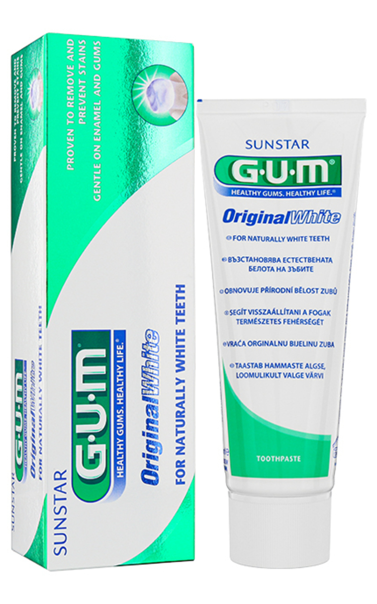Dantų pasta užtikrina natūralų dantų baltumą nepažeidžiant dantų emalio ir dantenų. Turi kliniškai ištirtas savybes užkirsti kelią naujų dėmių atsiradimui ir senų pašalinimui. Natūralus dantų baltumas gali būti prarastas atsiradus dėmėms nuo maisto, gėrimų (pvz.: kavos, arbatos ir vyno), rūkymo, vaistų ar natūralaus senėjimo proceso. Reguliariai naudojant GUM® ORIGINAL WHITE dantų pastą efektyviai pašalinsit senas dėmes ir užkirsit kelią naujų atsiradimui be abrazyvinių ir balinamųjų medžiagų pagalbos. Skirta valyti dantis 2-3 kartus per dieną. Skirta tik suaugusiems!
