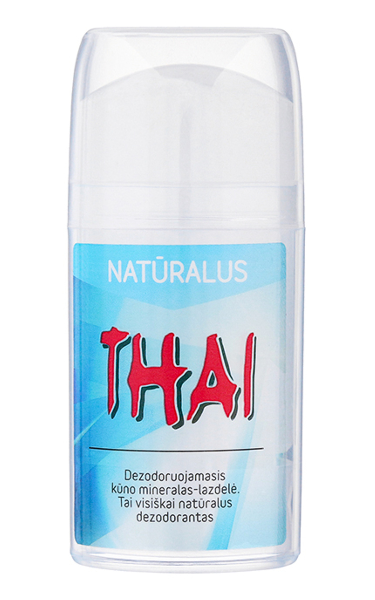 THAI dezodoruojamasis kūno mineralas pagamintas iš natūralių susikristalizavusių mineralinių druskų, kurios stabdo prakaito kvapą sukeliančių bakterijų augimą. Jo sudėtyje nėra kenksmingų chemikalų, aliejų, emulgatorių ar kvepalų. Tai – visiškai natūralus dezodorantas.