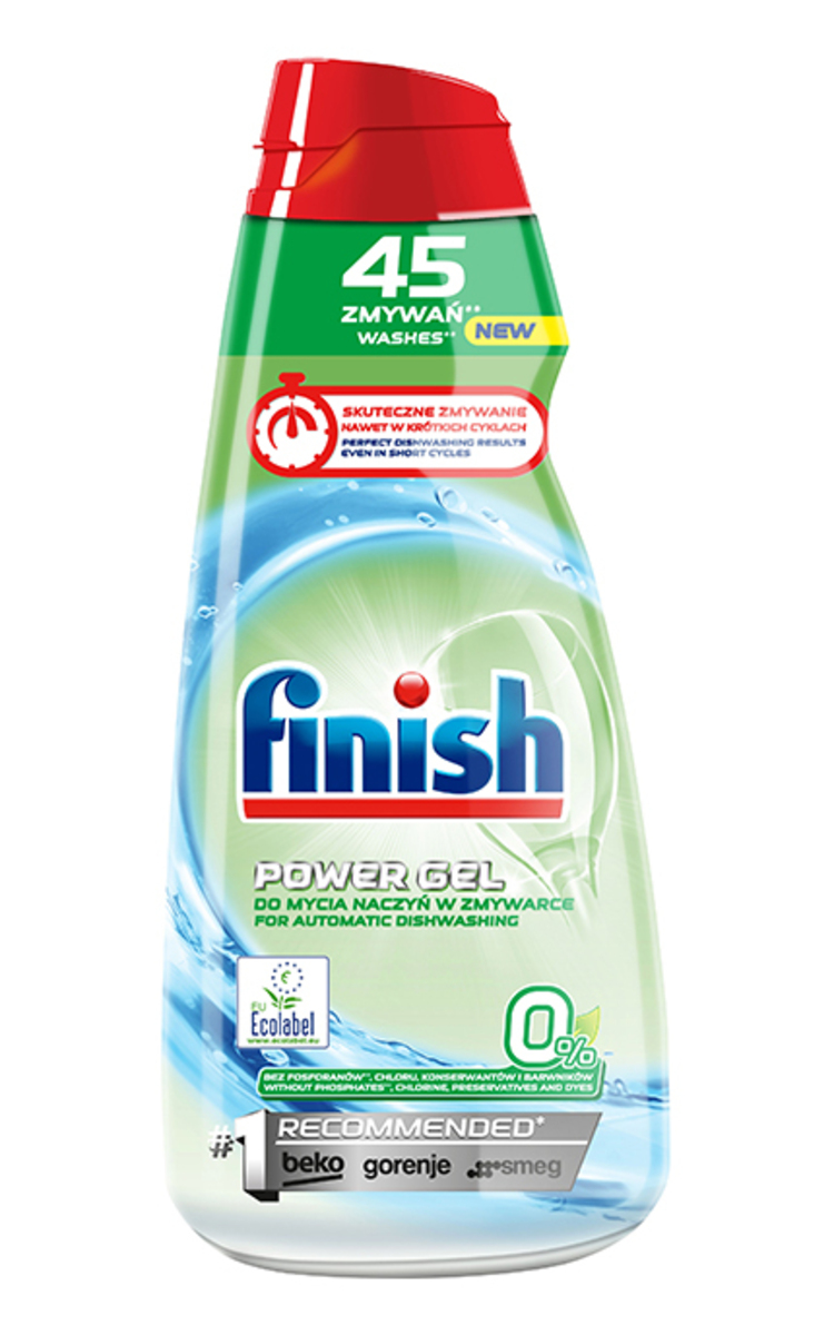 Gelis FINISH POWER GEL 0 % plauna 100 % taip pat gerai kaip kiti geliai FINISH***, bet jo sudėtyje nėra fosfatų**, chloro, konservantų ir dažiklių. Butelio užtenka iki 45 plovimų**. Ištirpsta 10 kartų greičiau nei tabletės FINISH ALL IN 1.