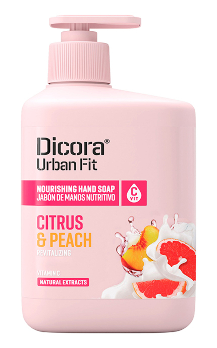DICORA URBAN FIT maitinamasis rankų muilas CITRUS & PEACH su vitaminu C, gaivinamuoju citrusinių vaisių ir persikų ekstraktu. Suteikia gaivų drėkinimą, oda atrodo stangri ir sveika. Vitaminas C aktyvina odos apsaugines funkcijas ir gali padėti lėtinti odos senėjimo procesą.