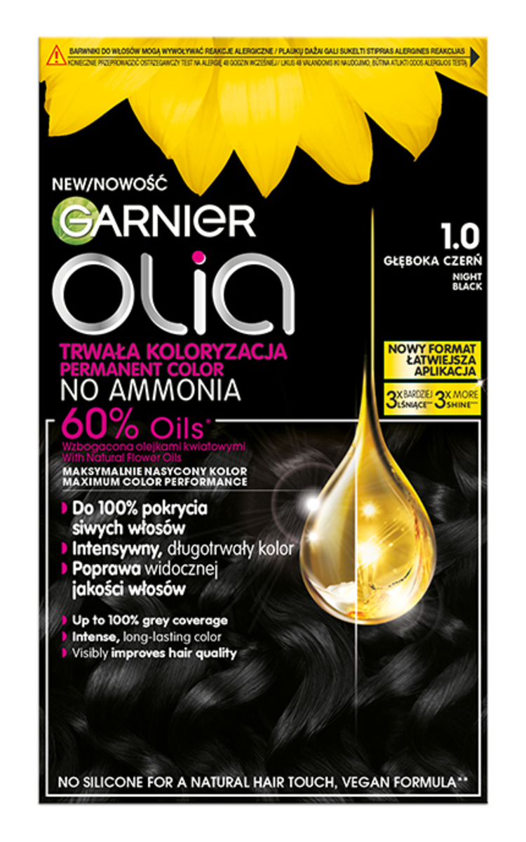 Garnier Olia – tai ilgalaikiai plaukų dažai, papildyti gėlių aliejais. Užtikrina maksimaliai sodrią spalvą ir visiškai nudažo žilus plaukus*.
