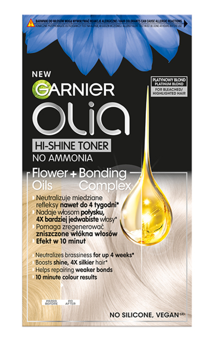 Olia Hi-Shine plaukų tonavimo priemonė padeda atsikratyti šiltų ir varinių atspalvių po plaukų dažymo arba laikotarpiu tarp dažymų. Suteikia išskirtinio švelnumo ir blizgesio, atkuria susilpnėjusias plaukų jungtis. Šalto atspalvio pigmentai akimirksniu neutralizuoja šiltus ir vario atspalvius ir suteikia tobulos blondinės išvaizdą. Kone dvigubai labiau žvilgantys plaukai*. Kondicionierius su plaukus atkuriančia technologija ir gėlių aliejais atkuria susilpnėjusias plaukų jungtis ir 5 kartus labiau sustiprina plaukus*, jie tampa 4 kartus švelnesni* ir pamaitinami 5 kartus daugiau*. Švelnus ir greitas poveikis. Gelio konsistencijos mišinį lengva užtepti. Dažymo rezultatas matomas po 10 minučių.