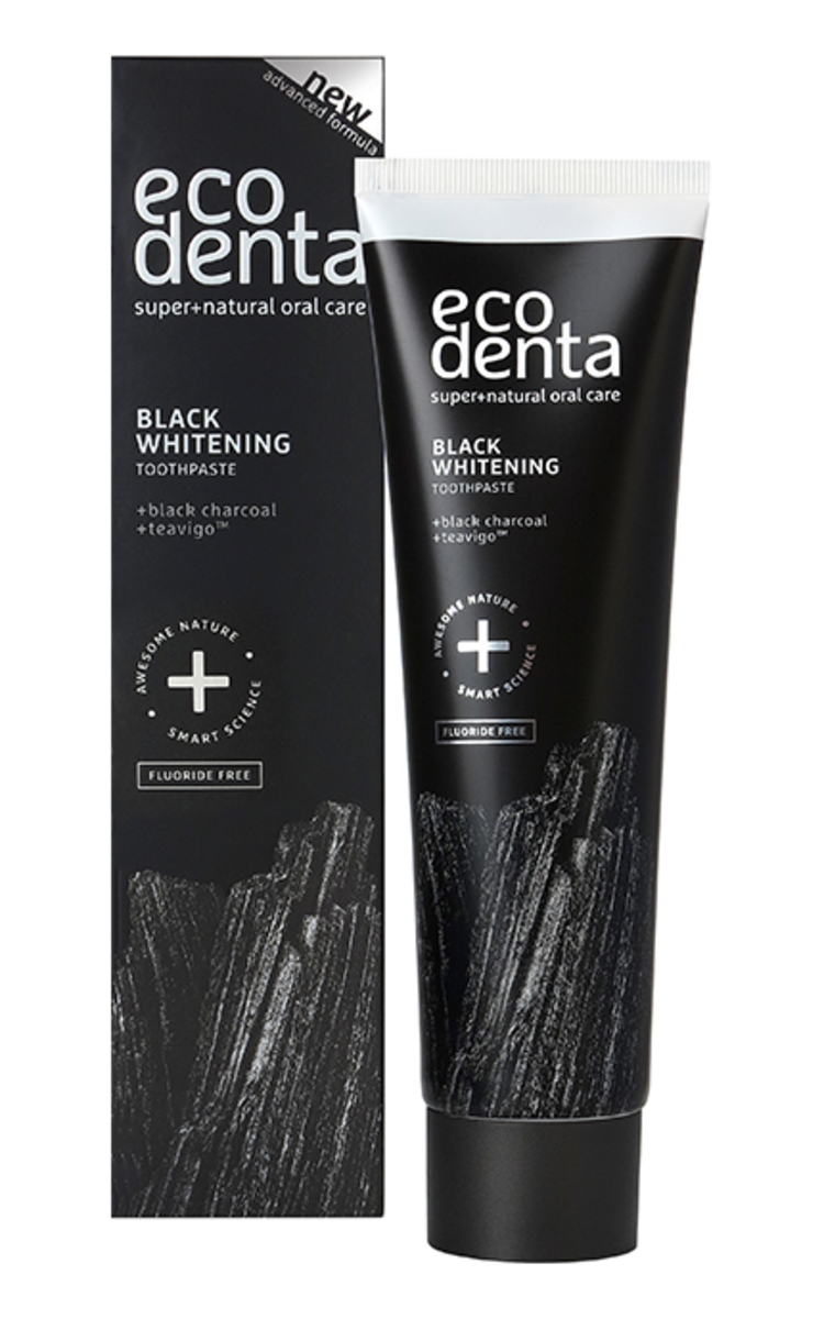 ECODENTA, juoda balinamoji dantų pasta su juodąja anglimi ir Teavigo, 100 ml 100 ml