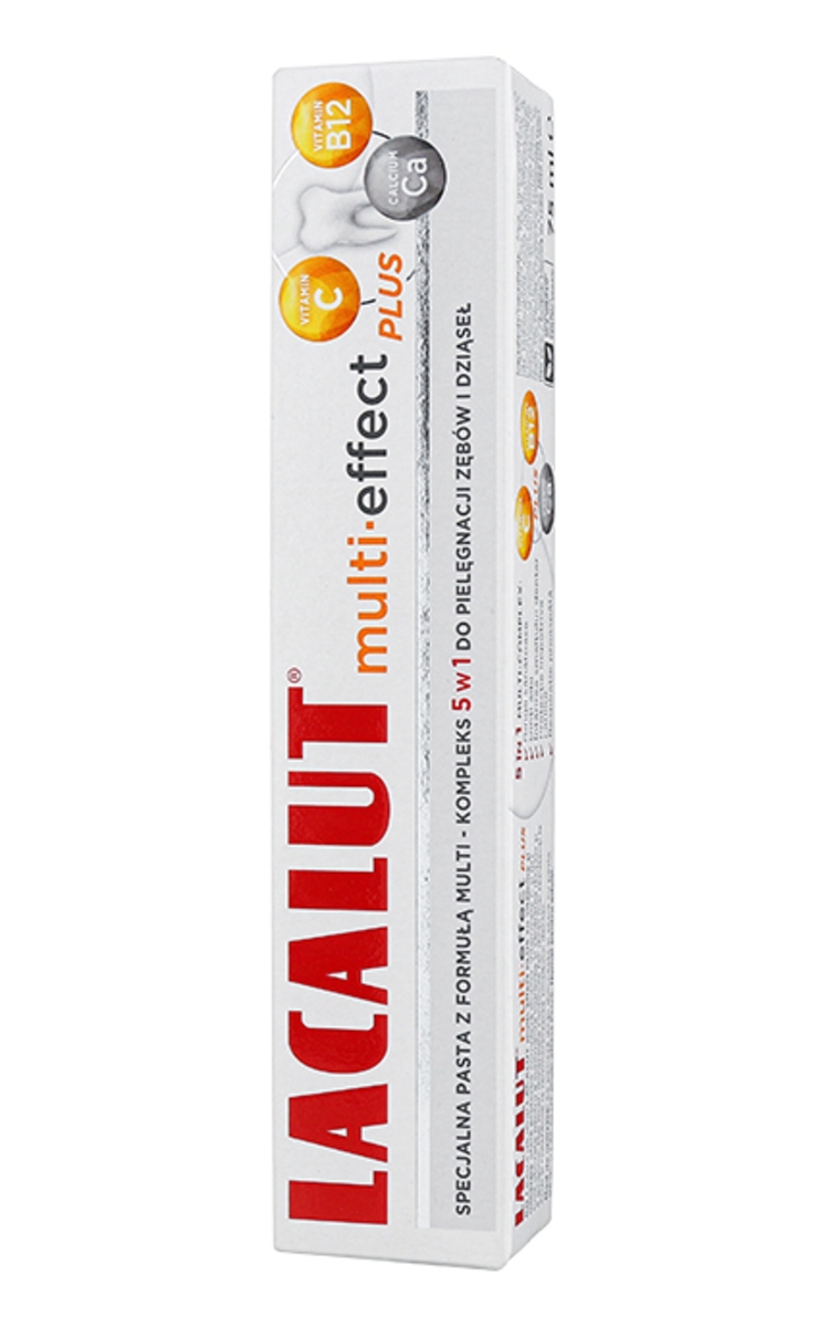 Dantenas ir dantis sustiprinti, dėl specialiųjų aktyviųjų ingredientų derinio padės LACALUT MULTI-EFFECT PLUS dantų pasta su vitaminais ir mineralais. Vitaminai ir mineralai B12, C, Ca efektyviai ir labai greitai rezorbuojasi per burnos gleivinę ir dantenas suteikdami visapusę dantų ir dantenų priežiūrą.