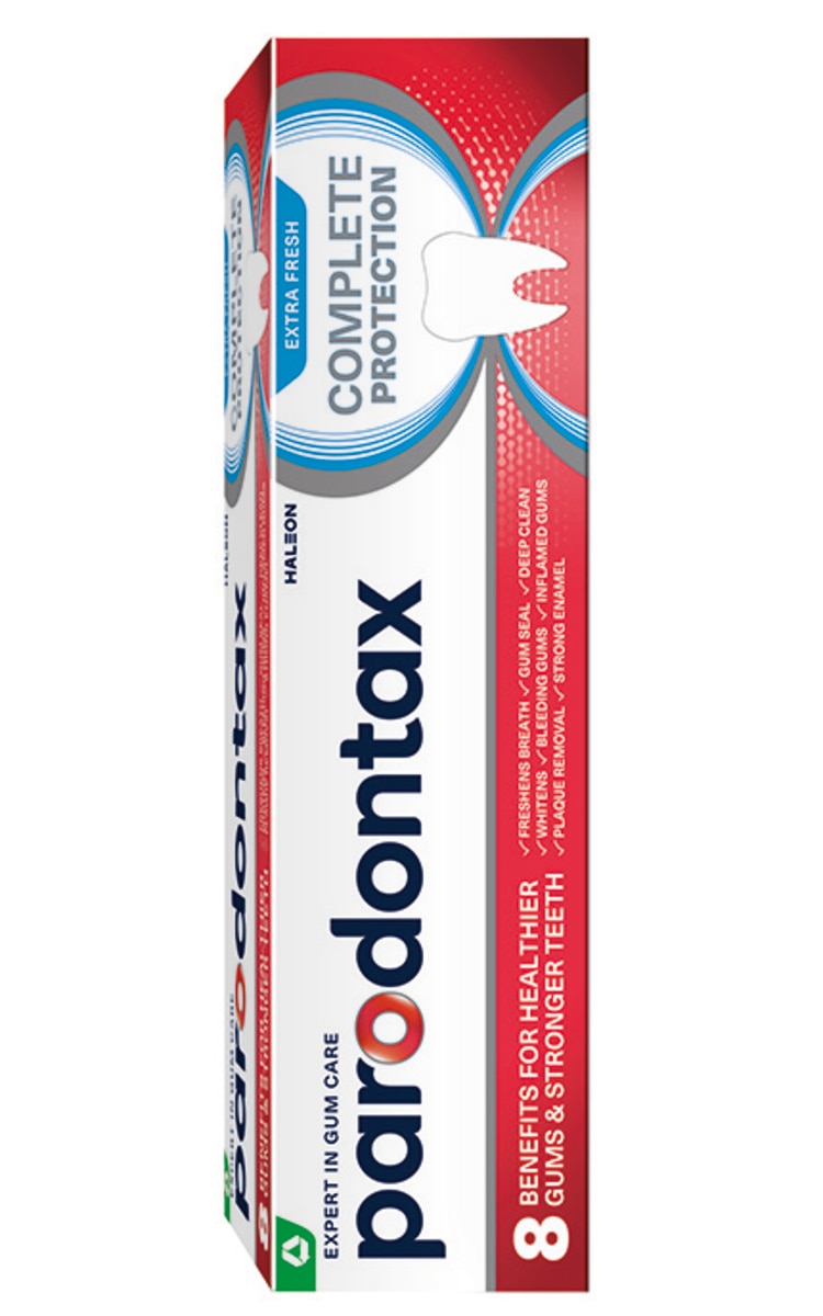 PARODONTAX COMPLETE PROTECTION EXTRA FRESH padeda išlaikyti sveikesnius dantenis bei dantenas. Gaivumo pojūtis ir sveikesni dantys – viskas vienoje dantų pastoje. Rekomenduojama valyti dantis kasdien du kartus per dieną.