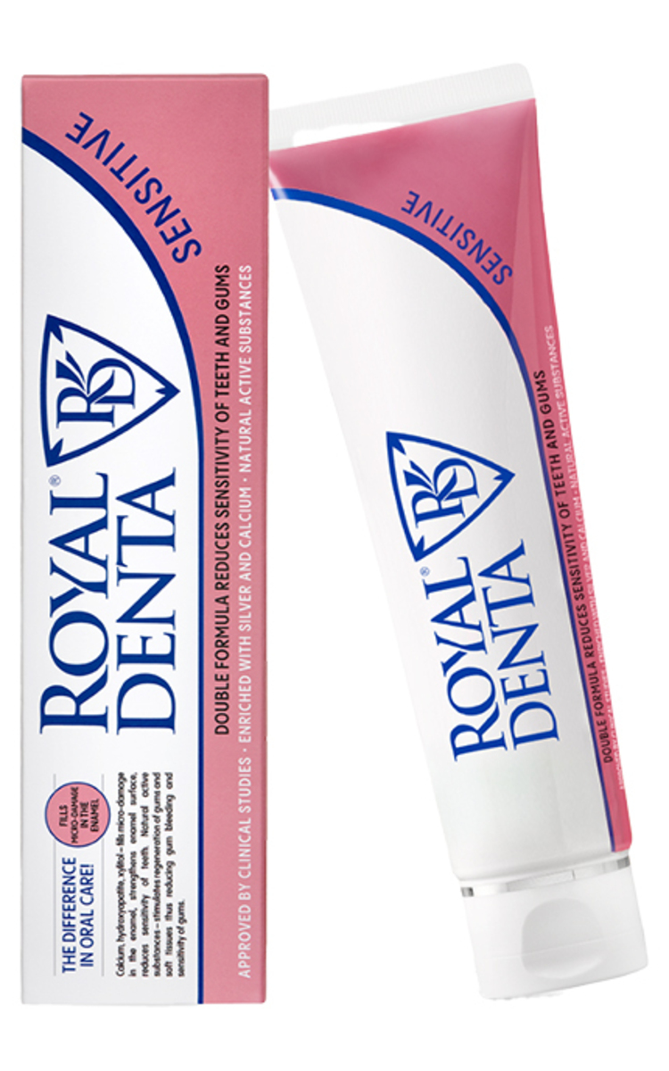 Royal Denta" Sensitive – biomimetinė dantų pasta be fluoro, skirta efektyviai mažinti dantų ir dantenų jautrumą. Jos sudėtyje esantys trikalcio fosfatas ir hidroksiapatitas padeda užpildyti atvirus dentino kanalėlius ir atstatyti pažeistą dantų emalį, todėl dantys tampa stipresni. Nepriklausomos laboratorijos tyrimo metu net 8 iš 10 dalyvių nurodė, kad naudojant "Royal Denta" Sensitive sumažėjo jų dantų jautrumas. Ši dantų pasta puikiai tinka kasdienei jautrių dantų priežiūrai ir padeda sumažinti jautrumą po burnos higienos procedūrų.
