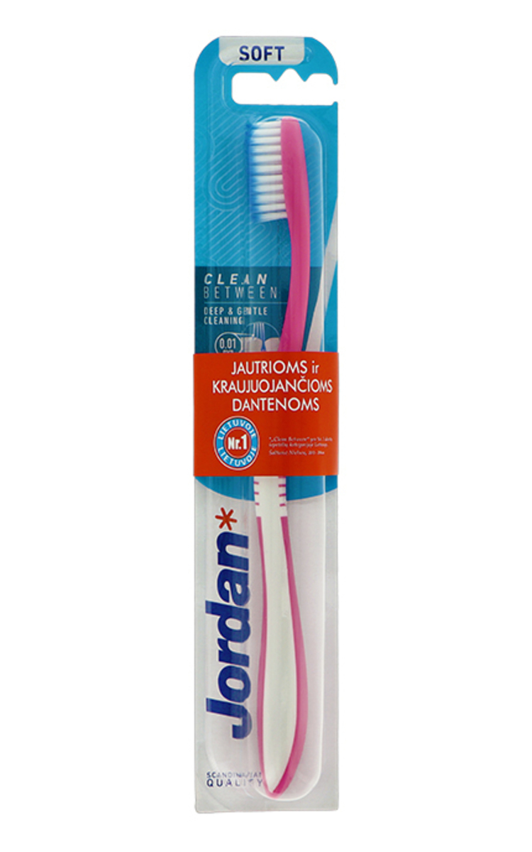 JORDAN CLEAN BETWEEN – specialiai sukurtas jautrias ir kraujuojančias dantenas turintiems žmonėms. Unikalios dantų šepetėlio savybės: