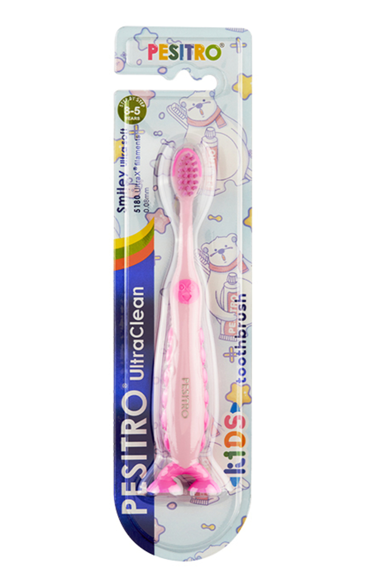 PESITRO 5180 Smiley UltraSoft žaismingos formos dantų šepetėlis turi silikonines kojytes, leidžiančias prisisiurbti prie vonios paviršiaus ir šepetėliui stovėti vertikaliai.Tinka vaikams nuo 3 iki 5 metų. Dėl 0,08 mm storio Ultra X šerelių šepetėlis yra neįtikėtinai minkštas.
