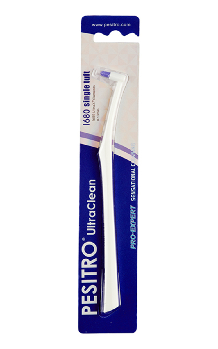PESITRO 1680 SingleTuft UltraSoft vieno danties šepetėlis pašalina apnašas net ypač sunkiai pasiekiamuose dantų paviršiuose. Puikiai tinka susigrūdusių dantų valymui ir priežiūrai ar nešiojant breketus. Valymo rutinoje naudojamas kartu su įprastu dantų šepetėliu, tarpdančių šepetėliais ir siūlu.