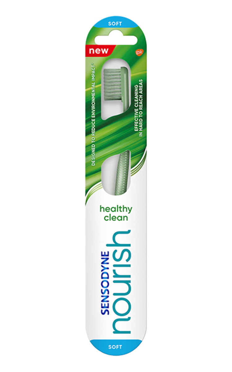 Sensodyne nourish healthy clean dantų šepetėlis. Draugiškas Jūsų dantims ir planetai: preciziškai suprojektuotas kotelis, pagamintas iš natūralaus šalutinio popieriaus gamybos produkto, šereliai pagaminti naudojant perdirbtą plastiką*; tankūs, smailėjantys minkšti šereliai švelniai, bet veiksmingai išvalo net sunkiai pasiekiamas vietas. Pagaminta Kinijoje. Perdirbama pakuotė. Pakuotės sudėtyje nėra plastiko. Rūšiuokite kartu su popieriaus atliekomis. *iki 66%