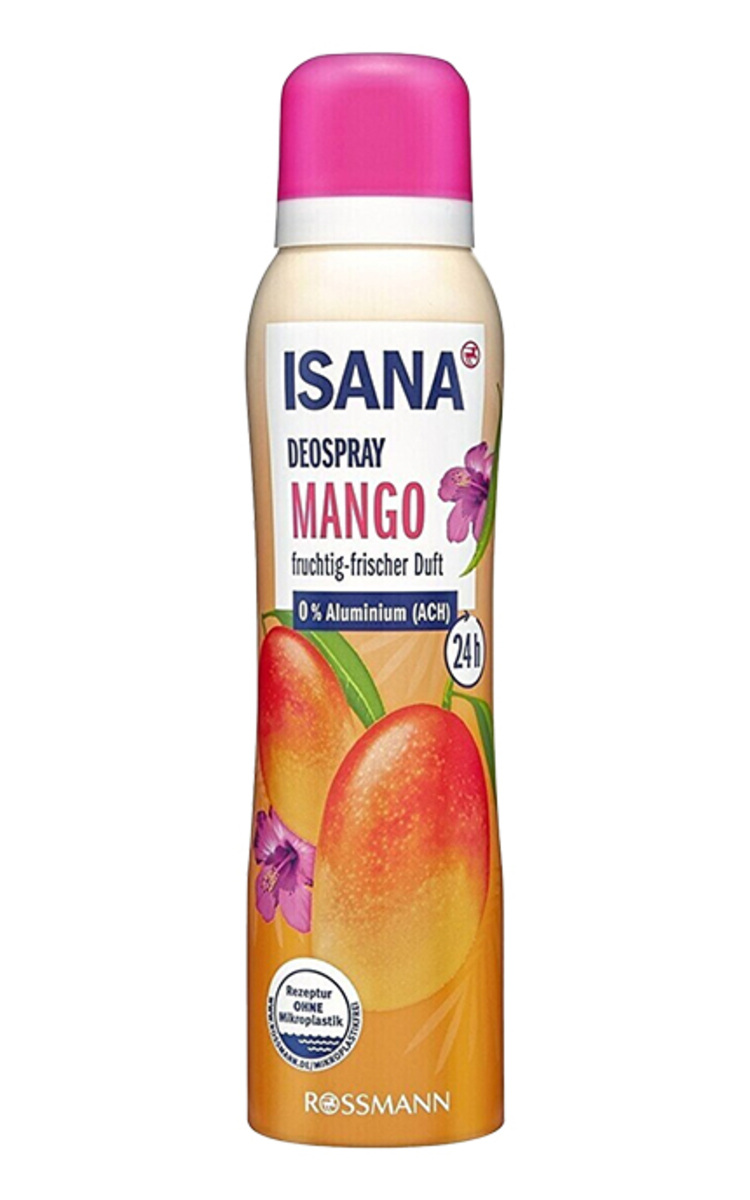 „Isana“ purškiamasis dezodorantas „Mango“ yra gaivaus mangų aromato ir ilgam apsaugo nuo nemalonaus kūno kvapo. Be aliuminio (ACH). Patikima dezodoruojamoji apsauga visą dieną. Dezodorantai „Isana“ su 24 val. veikliuoju kompleksu apsaugo ir puoselėja odą visą parą.