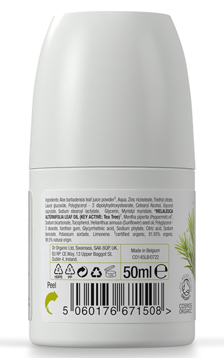 Aloe Barbadensis Leaf Juice, Aqua (Water), Zinc ricinoleate, Triethyl Citrate, Lauryl lucoside, Polyglyceryl-2 Dipolyhydroxystearate, Glycerin, Cetearyl Alcohol, Melaleuca Alternifolia (Tea Tree) Leaf Oil, Glyceryl Caprylate, Sodium Bicarbonate, Mentha Piperita (Peppermint) Oil, Polyglyceryl-3 Stearate, Sodium Stearoyl Lactylate, Isocetyl Palmitate, Cetraria Islandica (Icelandic Moss) Extract, Glycyrrhetinic Acid, Tocopherol, Helianthus Annuus (Sunflower) Seed Oil, Chondrus Crispus (Carrageenan) Extract, Xanthan Gum, Sodium Phytate, Sodium Benzoate, Potassium Sorbate, Citric Acid, Limonene.