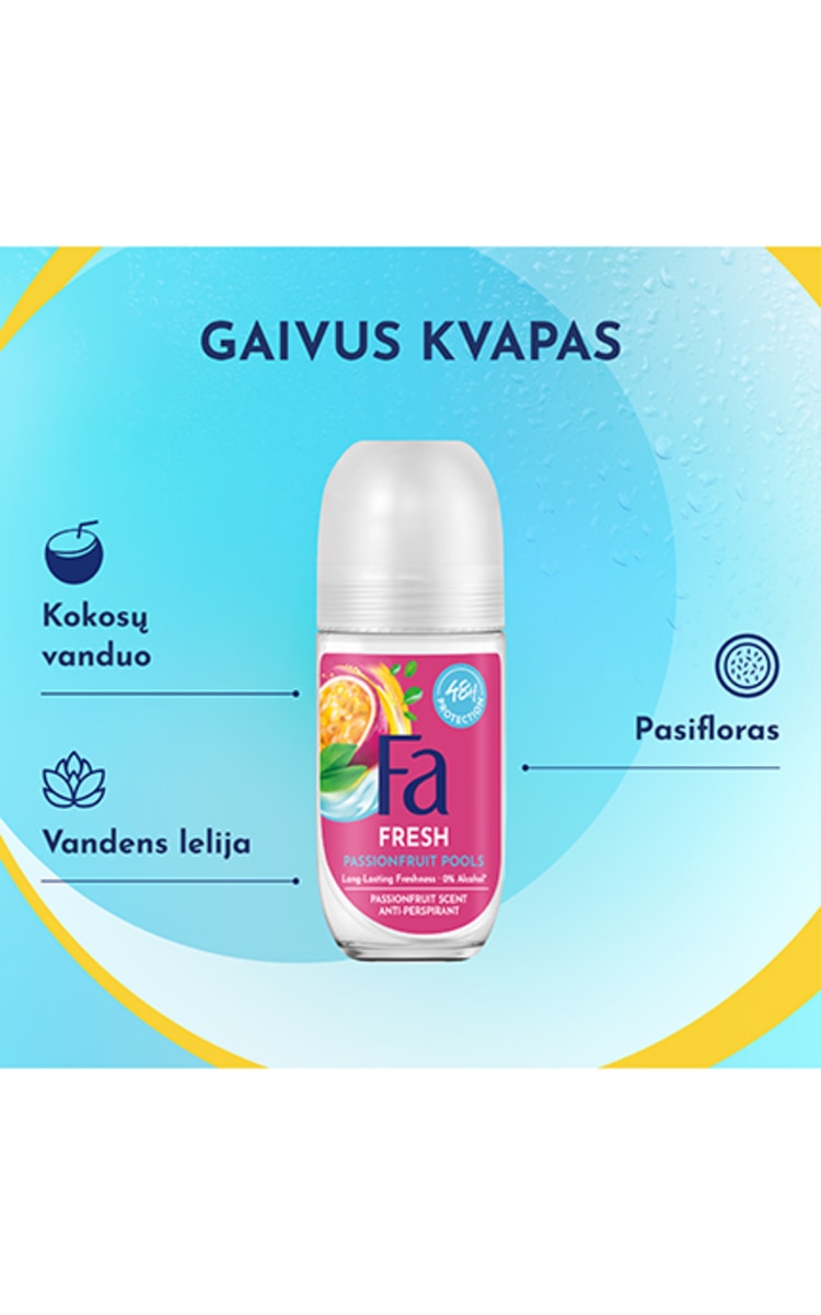 „Fa, Passionfruit, Feel Refreshed“, 50 ml – veganiškos* sudėties įkvepiančio pasiflorų ir kokosų vandens aromato rutulinis antiperspirantas. Pasiruoškite naujiems potyriams su šiuo įkvepiančio pasiflorų ir kokosų vandens aromato rutuliniu antiperspirantu moterims. Odai švelnus junginys iki 48 val. veiksmingai apsaugo nuo prakaito ir kvapų bei yra patikrintas dermatologų. *sudėtyje nėra gyvūninės kilmės ingredientų.