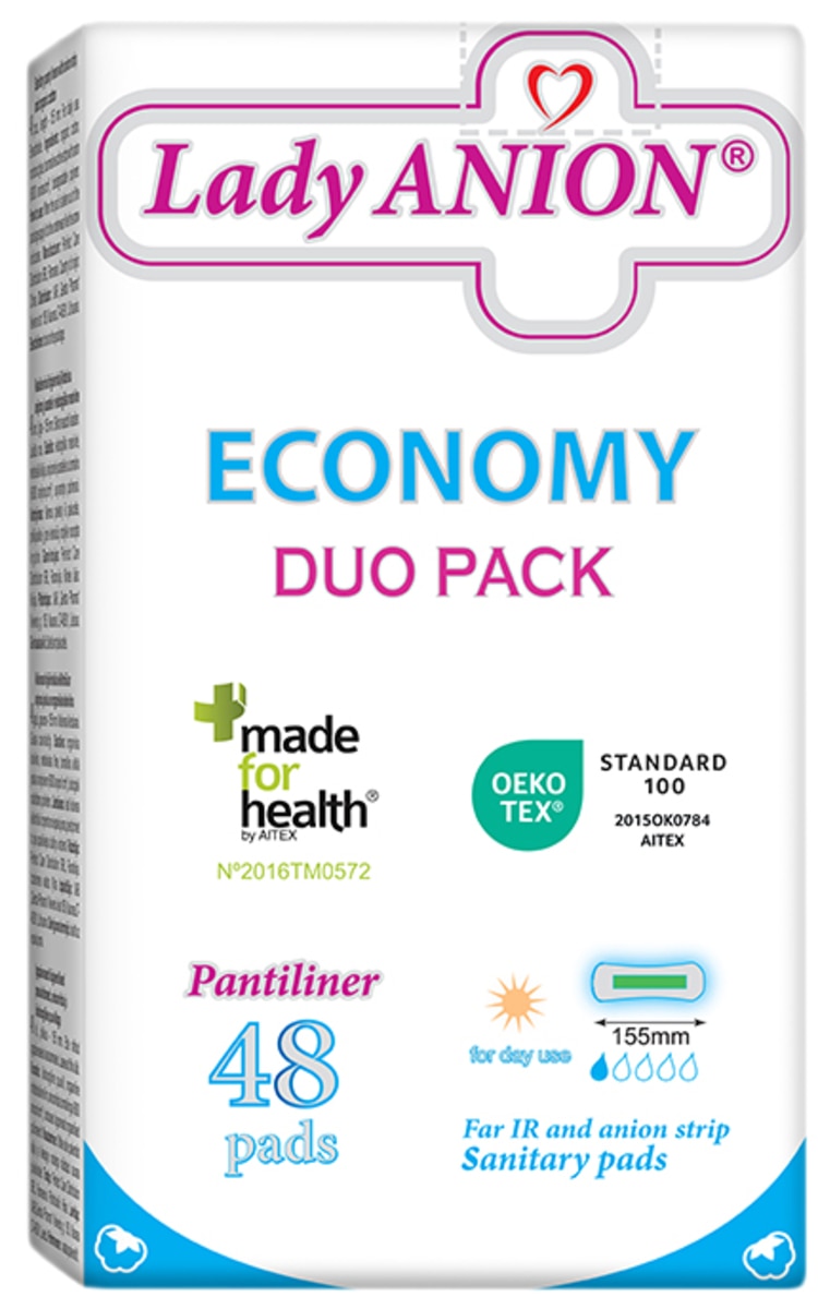 Kasdienio naudojimo plonų įklotų LADY ANION PANTILINER formulės sudėtyje meilė Jums abiems: gamtai ir Tavo gerai savijautai. Kasdienio naudojimo ploni įklotai LADY ANION PANTILINER pagaminti be šių kenksmingų medžiagų: pesticidų, sunkiųjų metalų, fenolių, alergijas sukeliančių dažų. Privalumai: