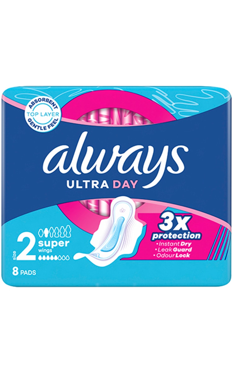 Rinkis trigubą higieninių paketų „ALWAYS Ultra Day Super“ (2 dydžio) su sparneliais apsaugą.