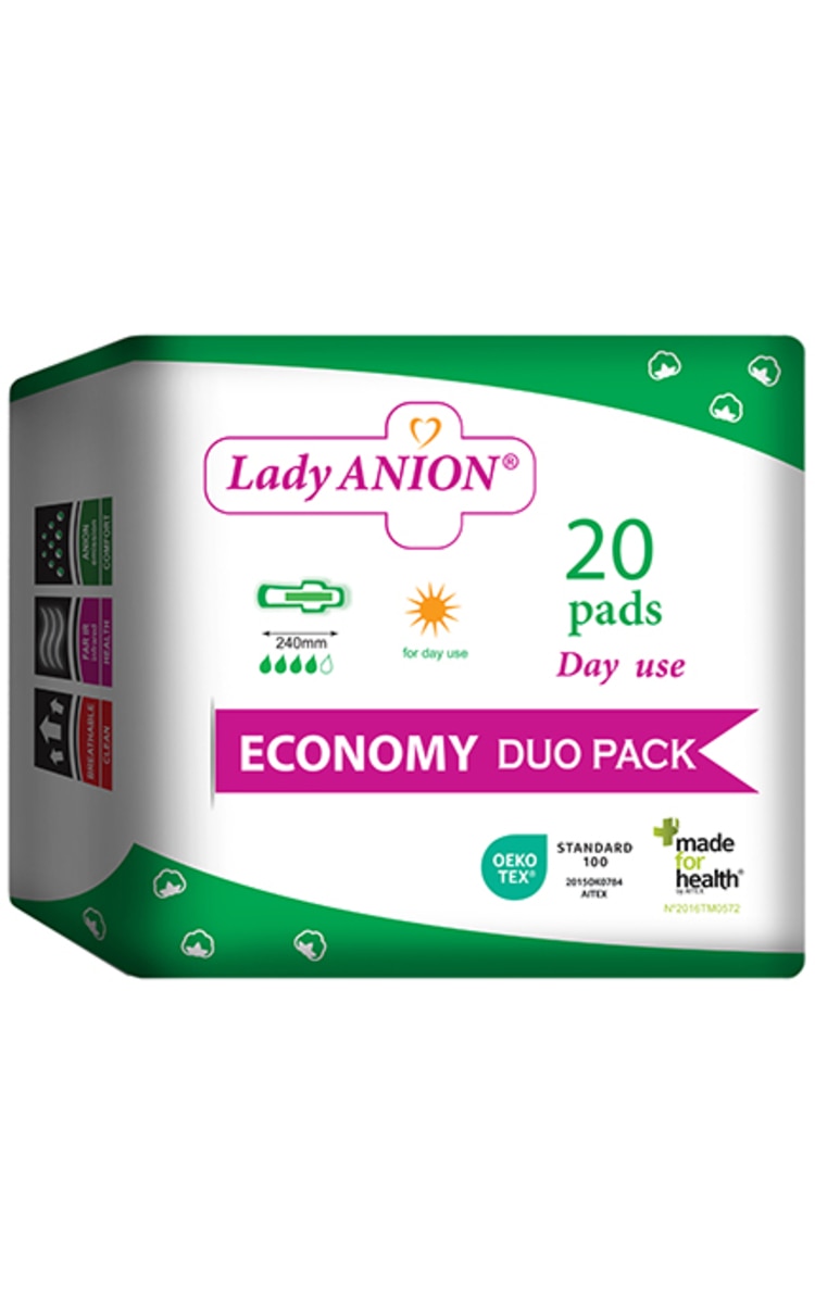 LADY ANION DAY USE dieninių paketų formulės sudėtyje meilė Jums abiems: gamtai ir Tavo gerai savijautai. DIENINIAI PAKETAI LADY ANION DAY USE pagaminti be šių kenksmingų medžiagų: pesticidų, sunkiųjų metalų, fenolių, alergijas sukeliančių dažų. Privalumai: