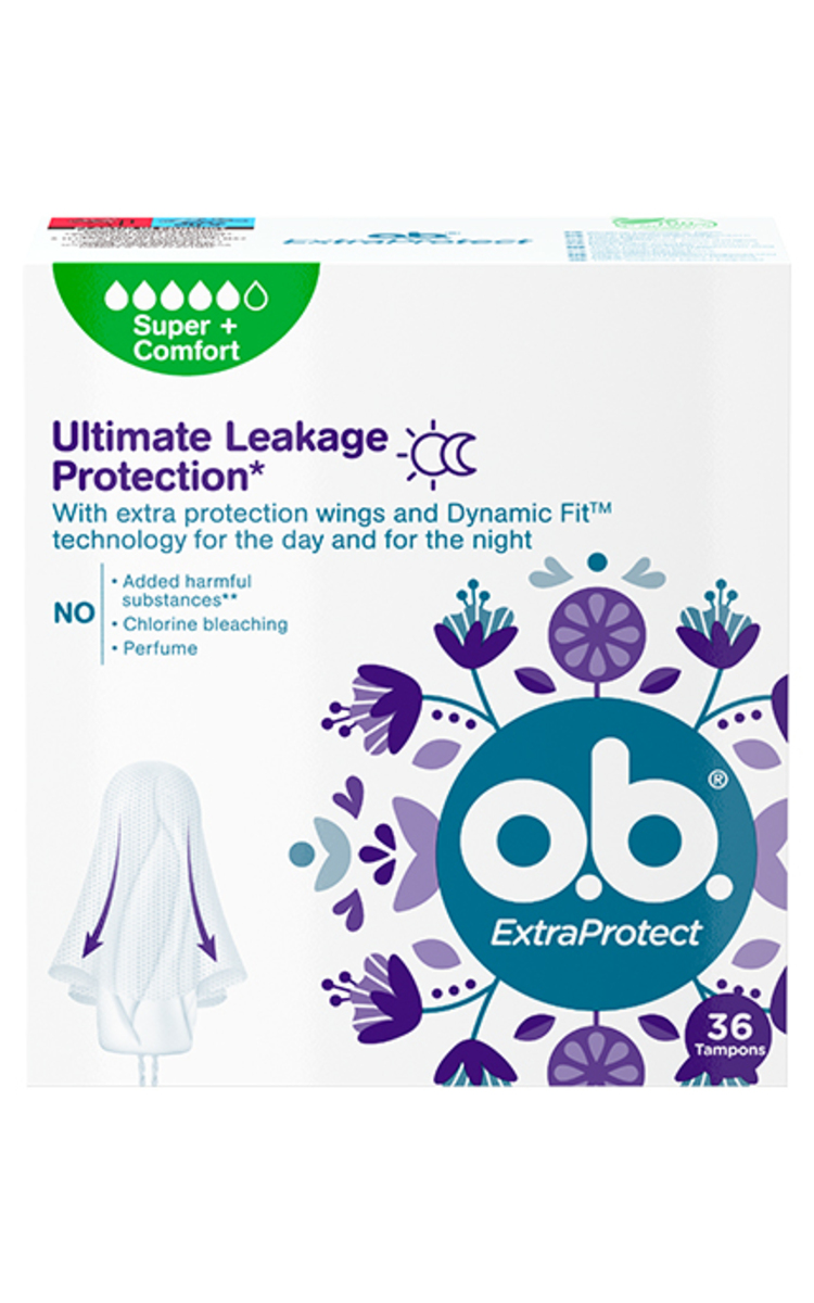 o.b.® ExtraProtect“ sujungia dvi pirmaujančias tamponų technologijas. Papildomi apsauginiai sparneliai ir „Dynamic Fit®“ technologija užtikrina iki 100 % apsaugą nuo skysčio, todėl esate švarios ir apsaugotos ir dieną, ir naktį: 1) „ExtraProtection“ sparneliai švelniai išsiskleidžia ir surenka skystį, kurį įprasti tamponai gali praleisti. 2) Unikali Dynamic Fit® su vingiuotais grioveliais efektyviai nukreipia skystį į tampono vidų. SUDĖTYJE NETURI žalingų medžiagų ** kvapiklių, nebalinta chloru. **išbandytas ir patvirtintas, kaip atitinkantis „OEKO-TEX ® STANDARD 100“ ribas. 100% augalinės kilmės pagrindu. Popierius iš patikimų šaltinių; perdirbtas popierius (min.75%). 100% atsinaujinanti energija naudojama mūsų pagrindinėje gamybos vietoje. „o.b.®“ sukūrė moteris ginekologė. Ginekologiškai patikrinta.
