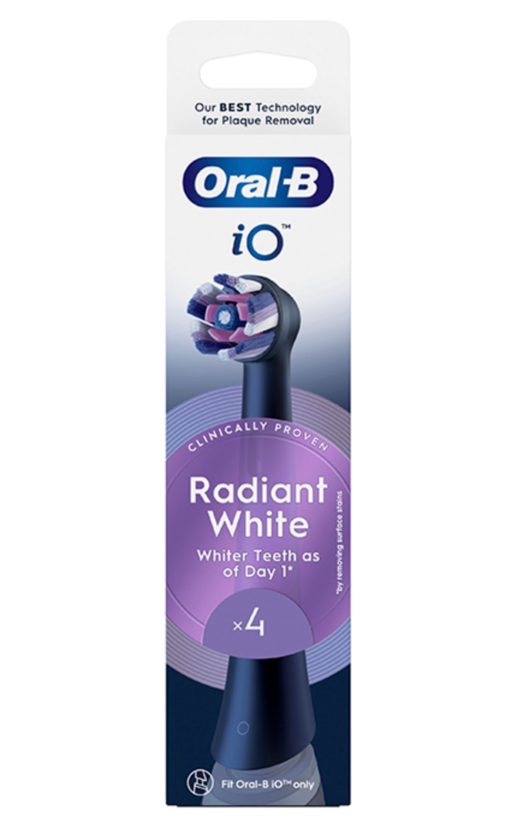 „Radiant White“ šepetėlio galvutės yra sukurtos išskirtinai „Oral-B iO“ elektrinio dantų šepetėlio koteliams ir padeda pašalinti iki 100 % daugiau apnašų, palyginti su įprastu rankiniu dantų šepetėliu, todėl dantys tampa švarūs ir tviskantys.