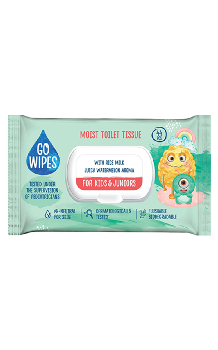 Drėgnas tualetinis popierius GoWipes For Kids&Juniors padeda jūsų vaikui savarankiškai pasirūpinti asmens higiena. Sudėtyje esanti losjono formulė, papildyta subtiliomis medžiagomis su natūraliais ingredientais – ryžių aliejumi ir ryžių krakmolu. Po efektyvaus švelnaus valymo, oda tampa šiek tiek pudruota, kad jūsų vaikai jaustųsi užtikrintai švarūs. Sultingų arbūzų aromatas.