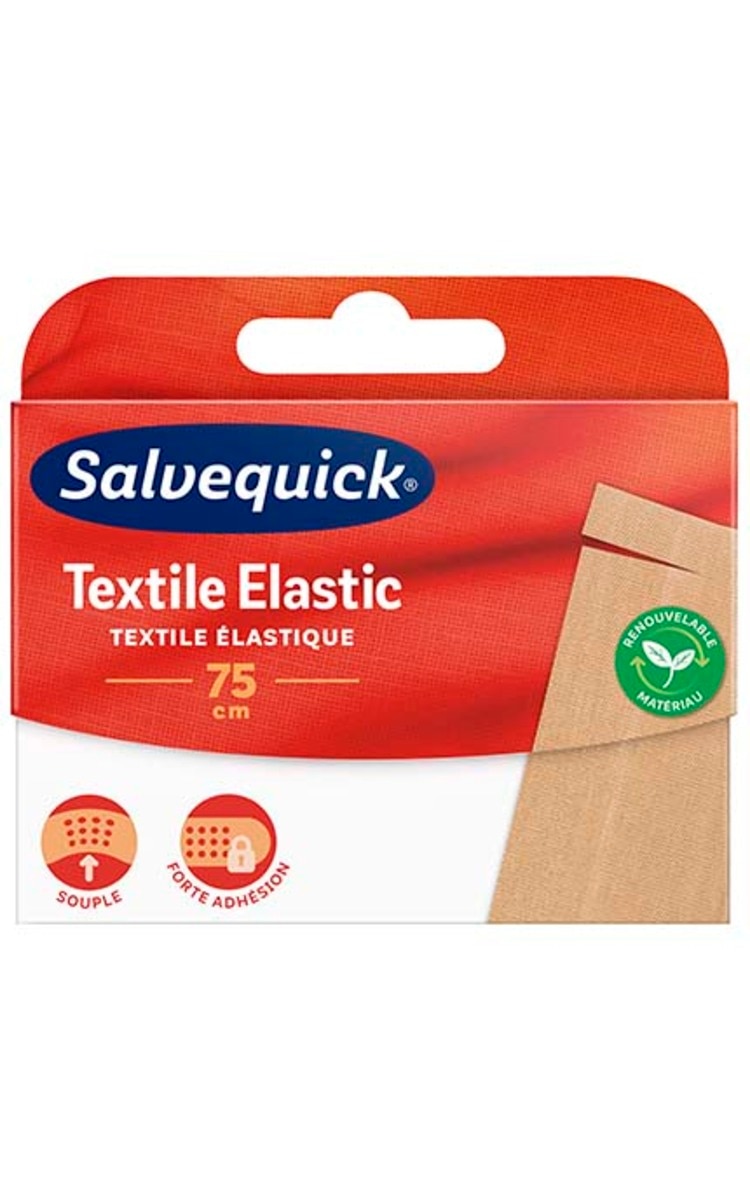 SALVEQUICK „Textile Elastic“ yra lankstūs tekstiliniai pleistrai, kurie stipriai prilimpa prie odos. Puikiai tinka naudoti alkūnėms, keliams, sąnariams. Šis kvėpuojantis tekstilės pleistras yra atsparus nešvarumams. Pakuotėje 75 centimetrai karpomo pleistro.