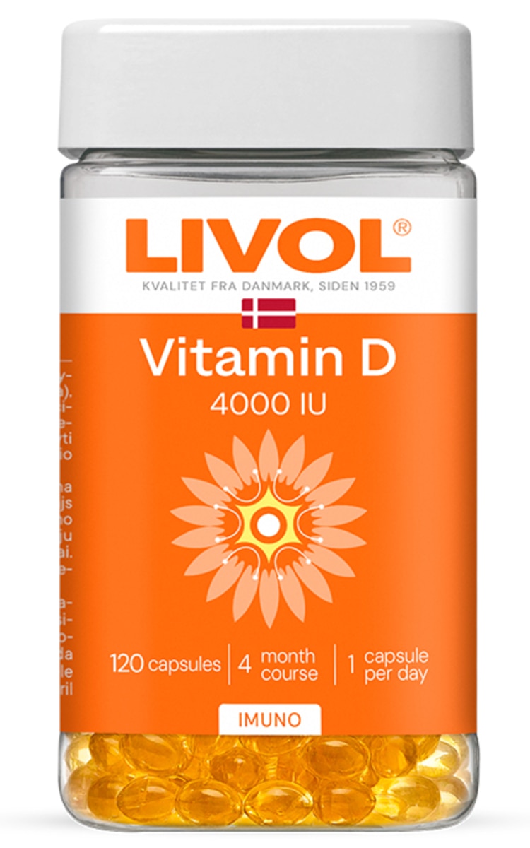 LIVOL Vitamino D 4000 TV kapsulės – aukštos kokybės Danijos ekspertų sukurtas vitamino D produktas. Vitaminas D ištirpintas pirmo spaudimo alyvuogių aliejuje.