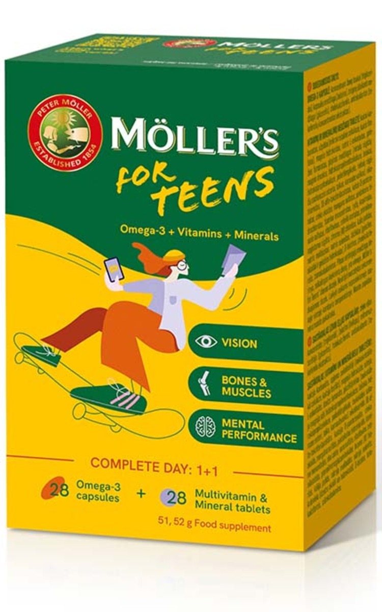 „Möller’s for Teens“ – pirmasis omega-3 ir vitaminų bei mineralinių medžiagų kompleksas paaugliams. Brendimo metu paauglio kūne įvyksta daug pokyčių, todėl aktyvus gyvenimo būdas ir intensyvi protinė veikla reikalauja papildomo dėmesio jaunam organizmui.
