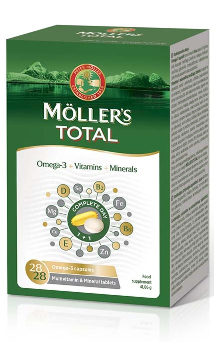 „Möller’s Total“ – optimalus omega-3, vitaminų ir mineralinių medžiagų derinys. Produktą sudaro 28 žuvų taukų kapsulės ir 28 vitaminų bei mineralinių medžiagų tabletės.