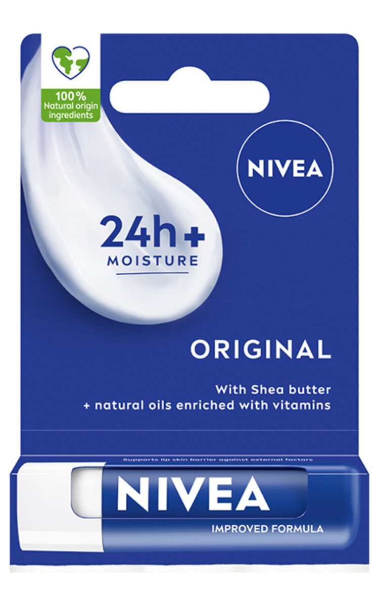 Rūpinkitės savo lūpomis su NIVEA® Original Care, kad jos būtų lygios, putlios ir apsaugotos nuo išsausėjimo! Unikali formulė su natūraliais aliejais ir taukmedžio sviestu pasižymi malonia lygia tekstūra, kuri akimirksniu ištirpsta ant lūpų ir drėkina jas 24 valandas*. Tinkamumas odai dermatologiškai patvirtintas. *Kliniškai patikrinta.