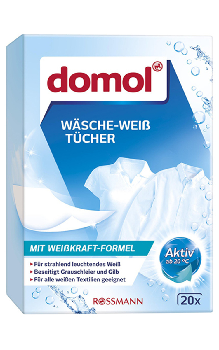 DOMOL skalbinių balinimo servetėlės šalina išblukimą bei gelsvumą.