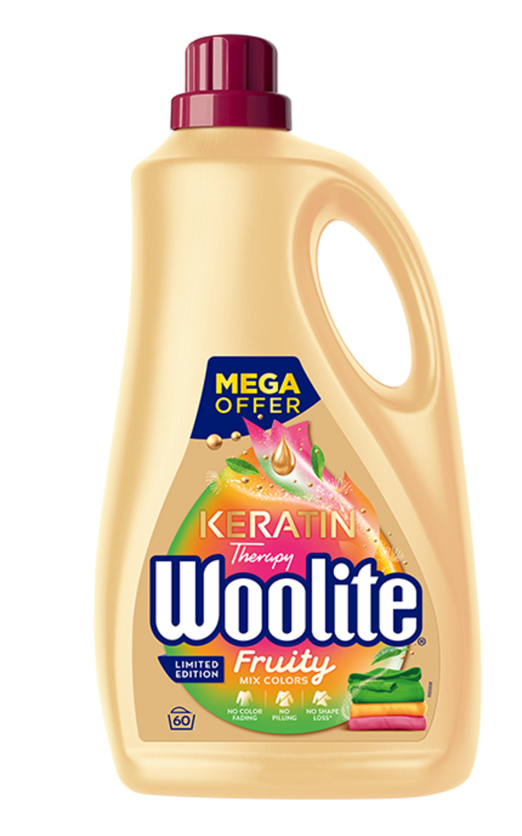 Ribotas leidimas. Skystas spalvotų drabužių skalbiklis su keratinu „Woolite Keratin Therapy Fruity“. Jūsų mėgstami drabužiai lyg nauji. Saugo drabužius nuo blukimo, pumpuravimosi, formos praradimo*.*Skalbiniai nesusitraukia ir neišsitampo skalbiant pagal drabužio etiketėje pateiktas rekomendacijas.