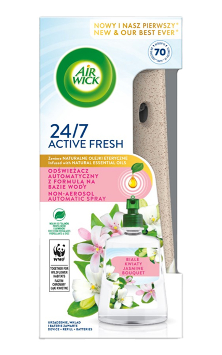 Naujas ir mūsų geriausias*. Iki 70 dienų gaivaus aromato**. 24/7 gaivaus aromato. Mūsų pirmasis neaerozolinis automatinis purškiklis jau čia. Mėgaukitės nuostabiais kvapais, prisotintais natūralių eterinių aliejų. Sukurtas pasitelkus veiksmingas kvapus neutralizuojančias molekules, kovojančias su blogais kvapais. Vandens pagrindo mišinys iš kruopščiai atrinktų ingredientų. Jūsų namai kvepės gaiva ir jaukumu. Buteliukas pagamintas iš žaliavos, kurioje 50 % perdirbto plastiko. Perdirbamas buteliukas. Purkštukas nėra perdirbamas. *Palyginus su prieš tai buvusiu automatiniu oro gaivikliu „Air Wick“.**Nustačius mažiausią prietaiso „Air Wick“ purškimo intensyvumą.