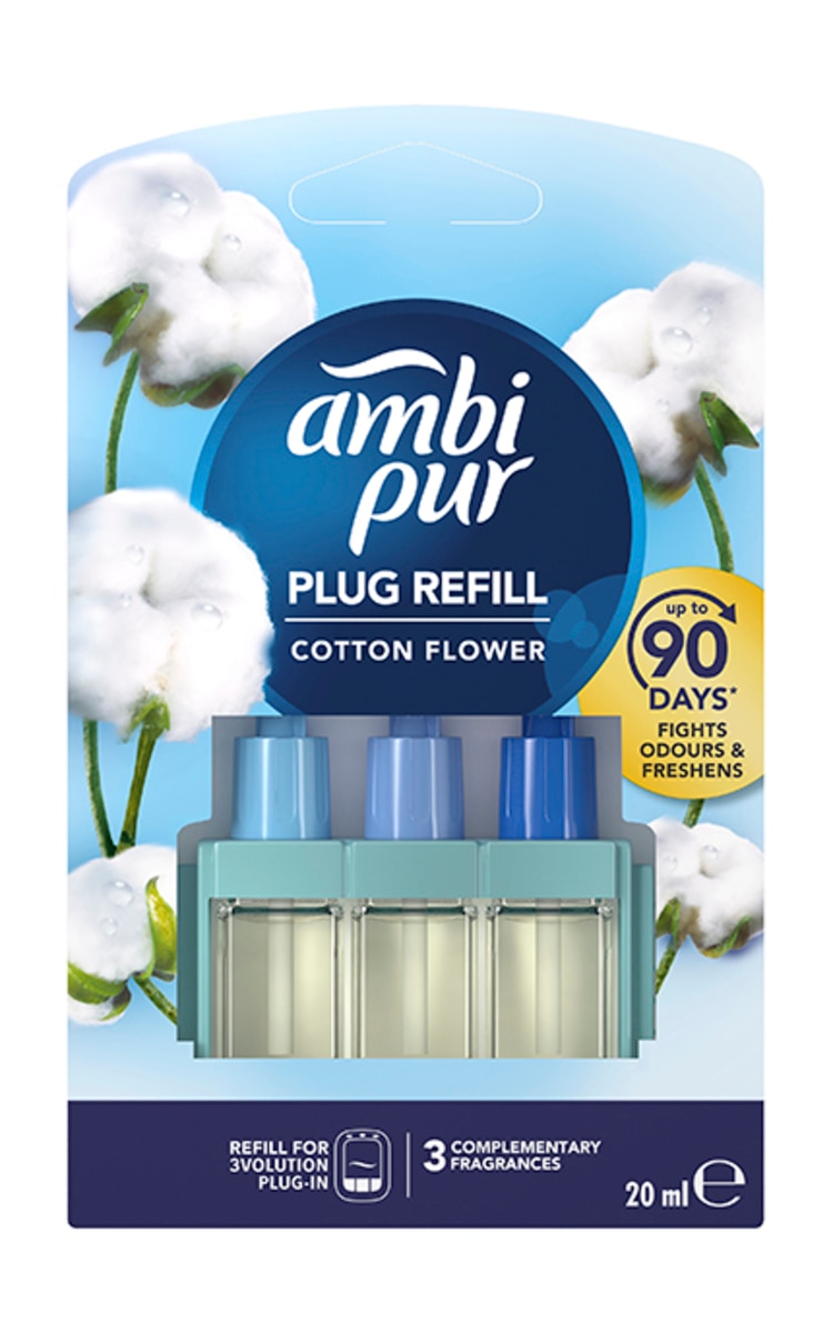 Atraskite „Cotton“ aromatą, kuris maloniai pasklis po aplinką ir ją užpildys. Pajuskite ore pasklidusio švaraus ir švelnaus aromato teikiamą ramybę. Naudodami įprastus elektrinius oro gaiviklius greitai priprantame prie aromatų ir jų nebeužuodžiame. „Ambi Pur“ „3Volution“ užtikrina nuolat juntamą gaivą, nes trys vienas kitą papildantys kokybiški aromatai pasikeičia kas 45 minutes.