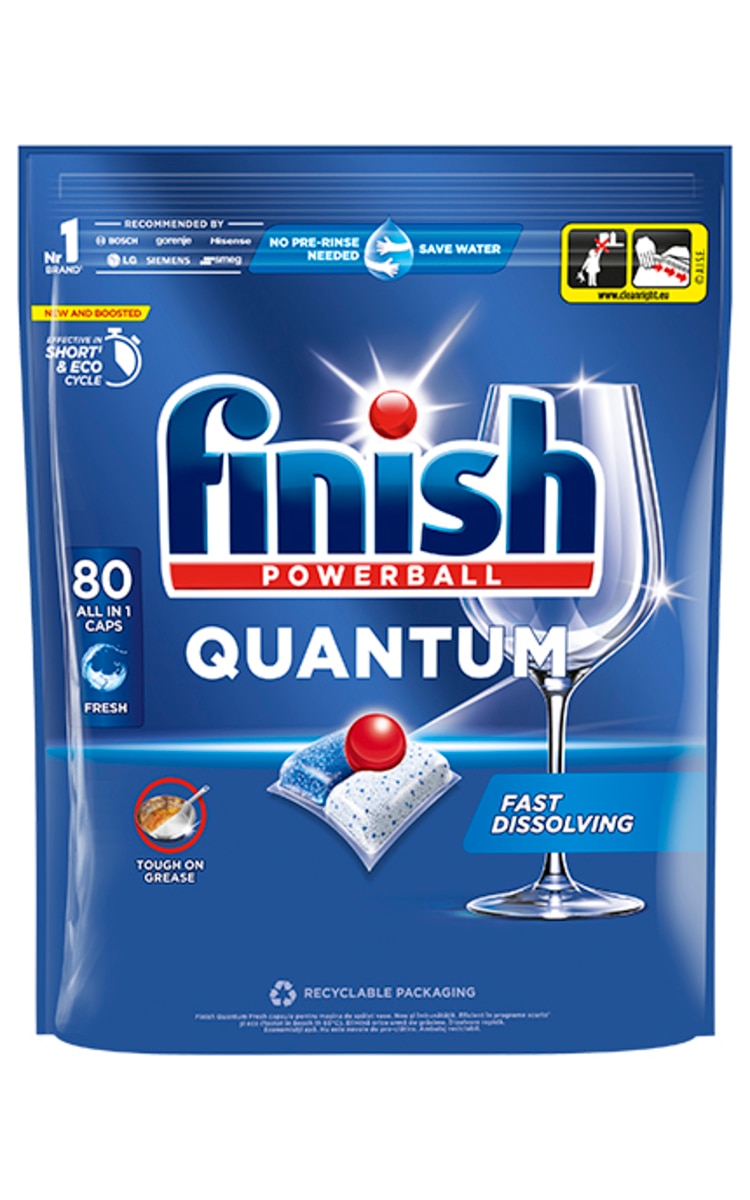 Kad išsaugotumėte kapsulių „Quantum“ kokybę, po naudojimo visada uždarykite pakuotę ir saugokite ją nuo šilumos bei drėgmės. Kad indai tikrai gerai nudžiūtų, naudokite indaplovių indų skalavimo skystį „Finish“.