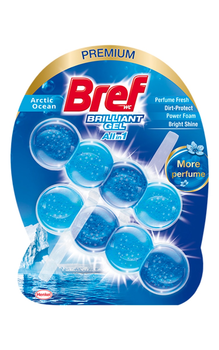 Tai pirmasis BREF gelinis valiklis-gaiviklis, pakabinamas po unitazo apvadu. Dėl „viskas viename“ formulės su keturiomis funkcijomis, automatinis unitazo valiklis sulig kiekvienu nuleidimu palaiko tualeto švarą, apsaugo, kad nepriliptų naujų nešvarumų, suteikia ypatingą gaivos gūsį ir puikų blizgesį. Nuleidus vandenį, tualeto valiklis-gaiviklis greitai suputoja ir atgaivina tualetą bei palieka malonų aromatą kitam asmeniui. BREF BRILLIANT GEL – tai puikus sprendimas Jūsų tualetui:
