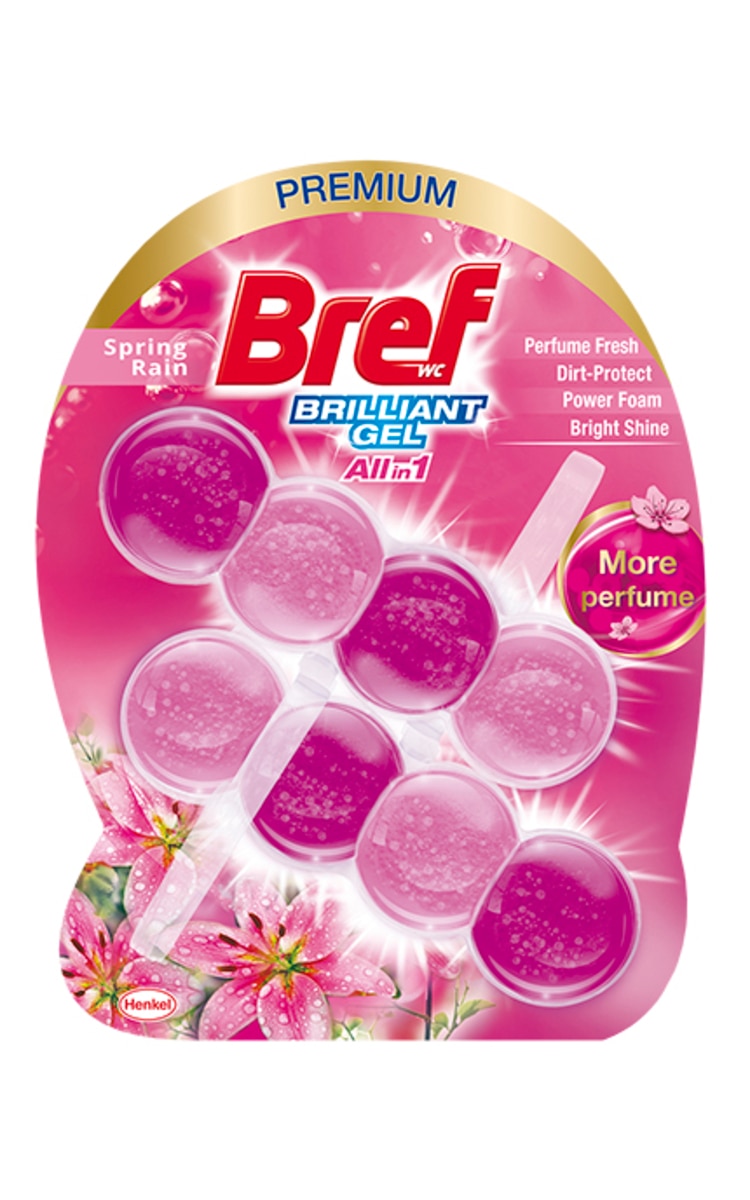 Tai pirmasis BREF gelinis valiklis-gaiviklis, pakabinamas po unitazo apvadu. Dėl „viskas viename“ formulės su keturiomis funkcijomis, automatinis unitazo valiklis sulig kiekvienu nuleidimu palaiko tualeto švarą, apsaugo, kad nepriliptų naujų nešvarumų, suteikia ypatingą gaivos gūsį ir puikų blizgesį. Nuleidus vandenį, tualeto valiklis-gaiviklis greitai suputoja ir atgaivina tualetą bei palieka malonų aromatą kitam asmeniui. BREF BRILLIANT GEL – tai puikus sprendimas Jūsų tualetui: