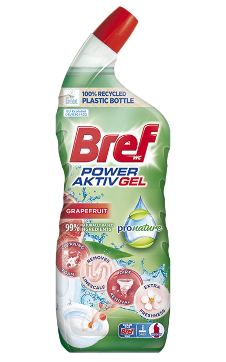 Unitazo valiklis BREF PRONATURE: kalkių nuosėdas šalinantis junginys su 90 % natūralios kilmės veikliosiomis medžiagomis. Veiksmingas valomasis poveikis ir gamtos įkvėptas greipfrutų aromatas – ypatingai gaivai. Pakuotė pagaminta iš 50 % perdirbto plastiko. Nuėmus etiketę, pakuotę rūšiuoti perdirbimui.