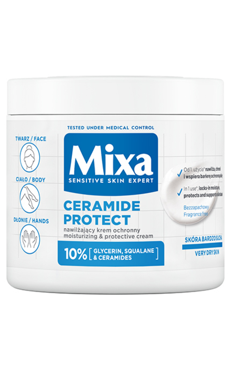 Mixa apsauginis ir drėkinamasis labai sausos odos kremas, papildytas 10 % veiksmingiausių veikliųjų medžiagų: keramidais, natūraliai aptinkamais išoriniame epidermio sluoksnyje, apsaugančiais odos lipidinį barjerą; skvalanu, žinomu dėl drėgmę epidermyje saugančių savybių; gliceroliu, kuris intensyviai drėkina ir apsaugo odą. Įrodytas veiksmingumas – daugiafunkcis kremas drėkina, apsaugo ir palaiko odos lipidinį barjerą nuo pat pirmojo naudojimo. Savybės: bekvapė, neriebi formulė, greitai įsigeria. Mixa prekės ženklas buvo sukurtas 1924 m. Prancūzijos vaistinėje ir buvo skirtas jautriai ir švelniai kūdikių odai. Remdamiesi šia patirtimi, sukūrėme visą seriją įvairaus amžiaus moterims skirtų veido ir kūno odos priežiūros priemonių. Visos mūsų priemonėse esančios veikliosios medžiagos yra kruopščiai atrinktos, o formulės išbandomos ant jautrios odos prižiūrint specialistams, siekiant padidinti jų veiksmingumą ir sumažinti alerginių reakcijų riziką.