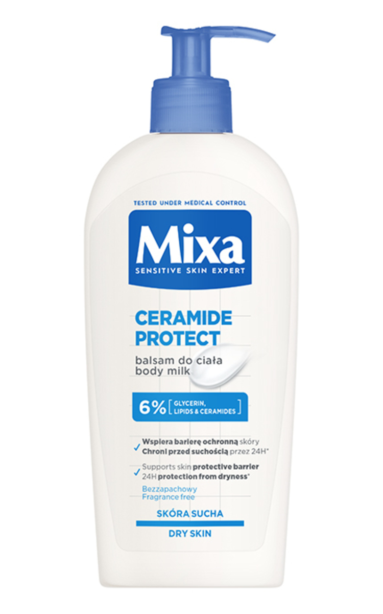 Mixa sausos odos apsauga, priemonė papildyta 6 % veiksmingiausių veikliųjų medžiagų: keramidais ir lipidais – natūraliai aptinkamais išoriniame epidermio sluoksnyje, apsaugančiais odos lipidinį barjerą; gliceroliu, kuris drėkina ir apsaugo odą. Įrodytas veiksmingumas – losjonas apsaugo odos lipidinį barjerą ir padeda išvengti odos išsausėjimo iki 24 valandų*. Savybės: bekvapė ir neriebi formulė, greitai įsigeria. Mixa prekės ženklas buvo sukurtas 1924 m. Prancūzijos vaistinėje ir buvo skirtas jautriai ir švelniai kūdikių odai. Remdamiesi šia patirtimi, sukūrėme visą seriją įvairaus amžiaus moterims skirtų veido ir kūno odos priežiūros priemonių. Visos mūsų priemonėse esančios veikliosios medžiagos yra kruopščiai atrinktos, o formulės išbandomos ant jautrios odos prižiūrint specialistams, siekiant padidinti jų veiksmingumą ir sumažinti alerginių reakcijų riziką.