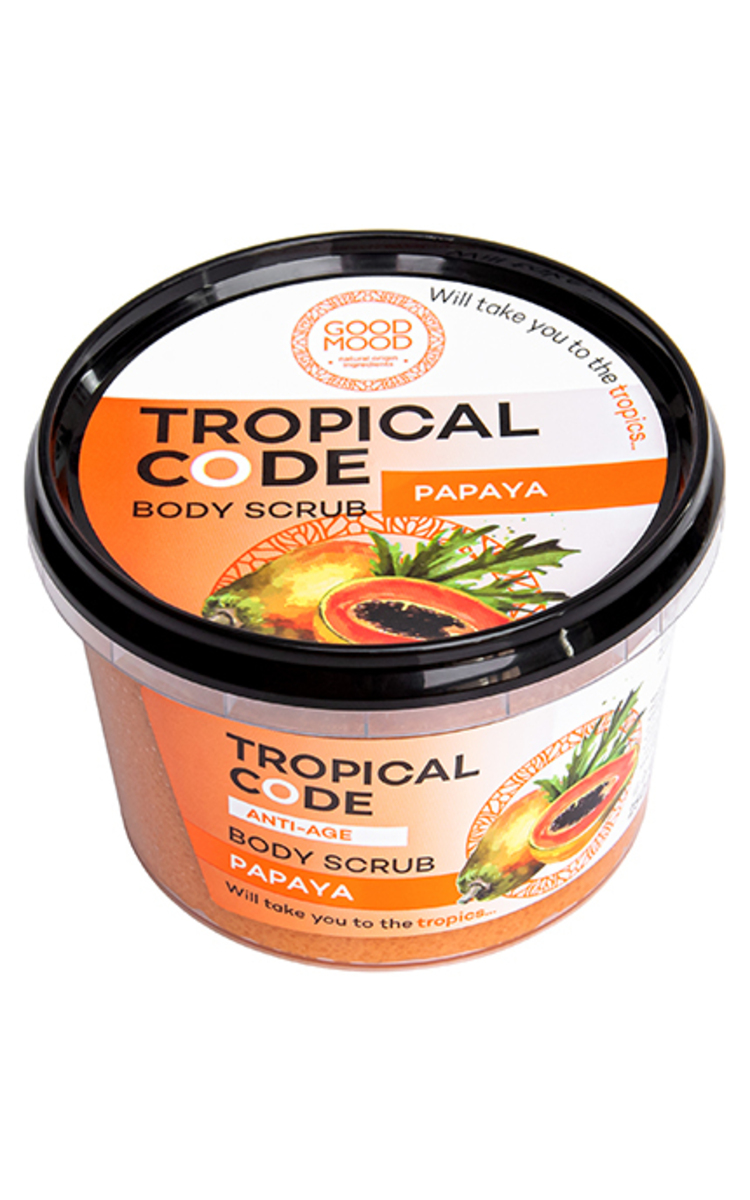 GOOD MOOD Tropical Code šveitiklis praturtintas papajos ekstraktu ir natūraliu cukrumi švelniai valo, nušveičia odą, jaunina ją. Malonaus vaisių aromato. Puiki priemonė pavers kūno priežiūros procedūras tikru malonumu.