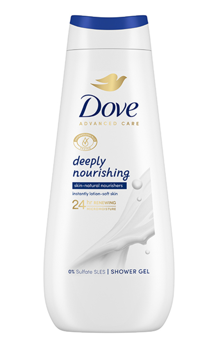 Skirtingai nuo įprastų kūno prausimo priemonių, „Dove Advanced Care“ papildytas novatoriška technologija „MicroMoisture“, palaikančia 24 valandas trunkantį odos drėkinimą. Ši „Dove“ technologija nusodina milijonus mažų, bet stipriai drėkinančių lašelių, kurie, užuot nuplauti, giliai įsigeria ir nuolat veikia su natūraliu odos atsinaujinimo procesu, kad sustiprintų odos barjerą ir padėtų išlaikyti bei padidinti drėgmę net Jums po prausimosi. Šis drėkinamasis kūno prausiklis leidžia palepinti savo kūno odą kiekvieną kartą prausiantis duše ir mėgautis 24 valandas trunkančiu švelnios, atgaivintos odos pojūčiu. Ir tai dar ne viskas – šioje formulėje naudojamas natūralios kilmės švelnių valiklių ir natūralių odos maitinamųjų medžiagų mišinys, kuris švelniai nuvalo odą ir pamaitinta mikrobiomą. Prausiklio sudėtyje nėra sulfatų SLES, jis sudarytas iš 98 %* biologiškai skaidžių ingredientų, ir supakuotas į 100 % perdirbtus plastikinius butelius** bei patvirtintas „PETA Vegan“.