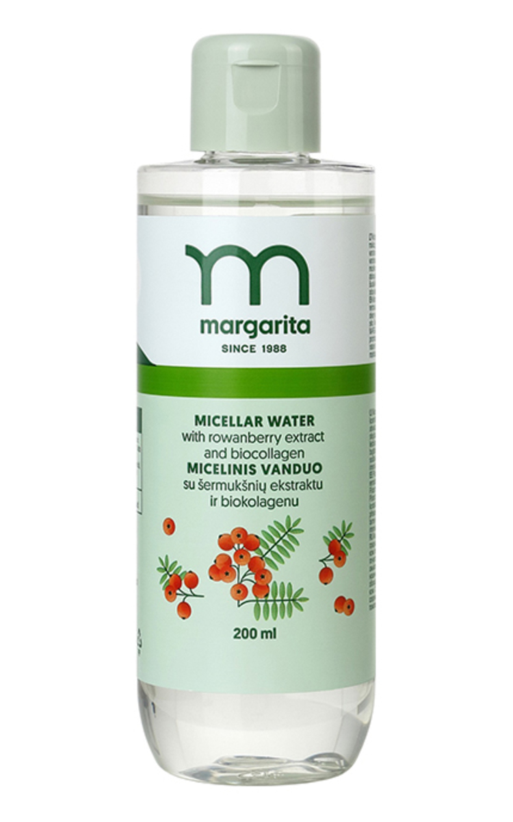 Švelnios sudėties, šermukšnių ekstraktu bei biokolagenu praturtintas micelinis vanduo. Puikiai valo makiažą, drėkina ir gaivina veido bei kaklo odą, suteikia gaivumo ir švaros jausmą. Sudėtyje esantis augalinis kolagenas – šiuolaikinė gamtos dovana odai – intensyviai drėkina, padeda išlaikyti odos elastingumą. Tinka naudoti nešiojant kontaktinius lęšius. Geriausiam rezultatui pasiekti rekomenduojama kartu naudoti MARGARITA naktinį ir dieninį kremus su šermukšnių ekstraktu bei paakių kremą su alavijų ekstraktu. Patikrinta dermatologų ir oftalmologų.