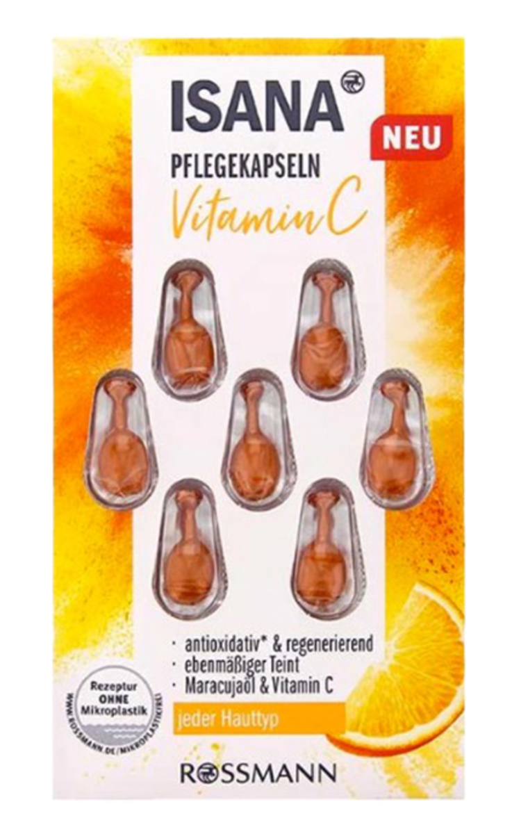 Isana Vitamin C kapsulės veido odos priežiūrai su antioksidacine švytėjimo formule. Apsaugo odą ir pašalina blyškumo bei nuovargio požymius, veido oda atsinaujina ir atrodo tobulai.