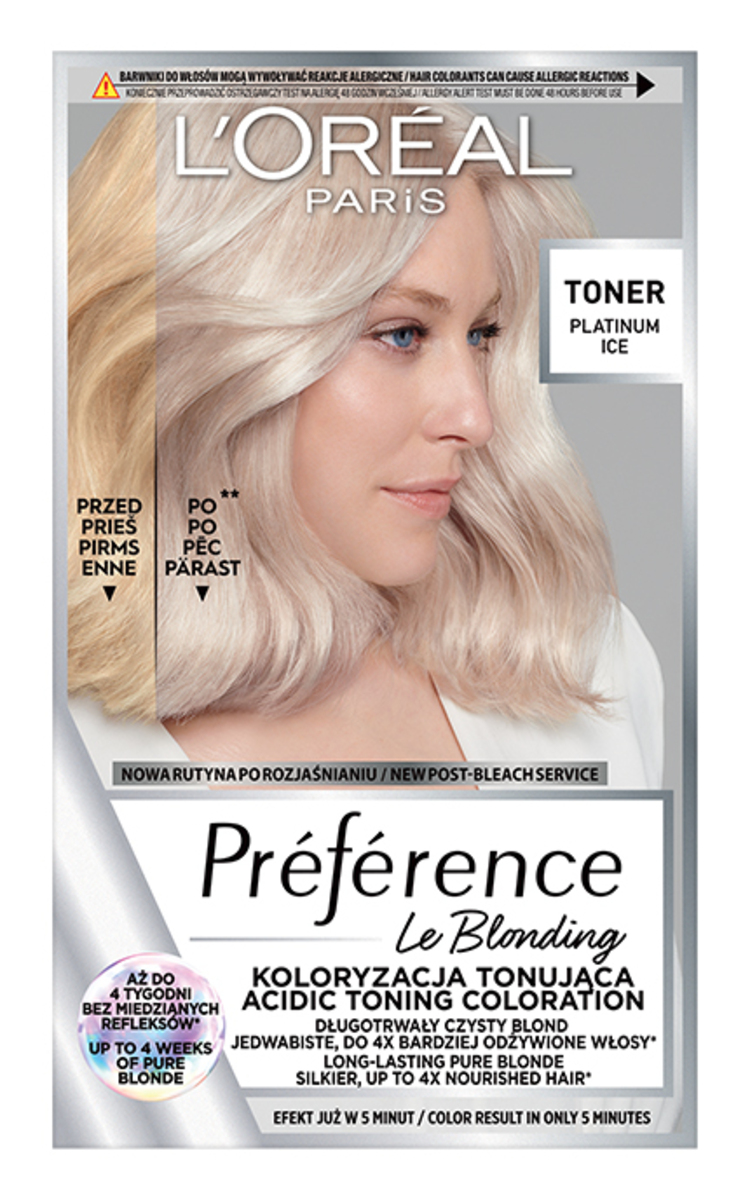 Préférence dažiklis su rūgštimi sukurtas taikant dažymo be amoniako technologiją. Veiksmingai neutralizuoja nepageidaujamus geltonos ir vario spalvos atspalvius, išlaikydamas ilgalaikį šviesios blondinės efektą. Iki 4 savaičių be vario atspalvių per 5 minutes*, švelnūs, 4 kartus labiau maitinami plaukai* Panaudoję Préférence dažiklio su rūgštimi, užtepkite kondicionieriaus ir plaukai taps glotnesni ir šilkiniai.* * Instrumentinis bandymas. Rekomenduojama šviesintiems plaukams. Puikiai tinka panaudojus Préférénce Ultra Platinium Bleach. Ilgesniems nei iki pečių ilgio plaukams reikia daugiau nei vienos pakuotės, kad jie būtų visiškai nudažyti. Nešviesina plaukų, nenudažo žilų plaukų.
