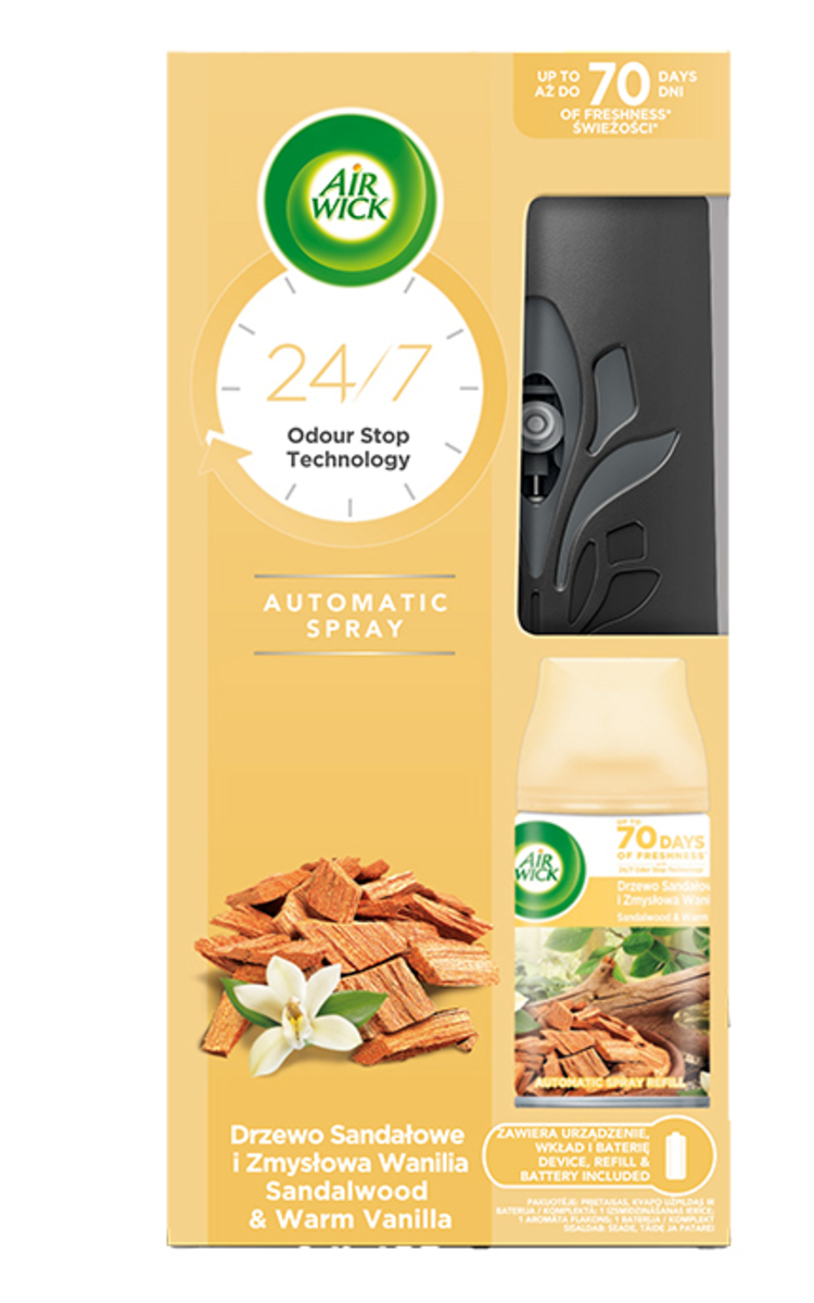 Atsiliepimai AIR WICK, automatinis oro gaiviklis su santalų ir jausmingos vanilės kvapo užpildu, 250 ml.