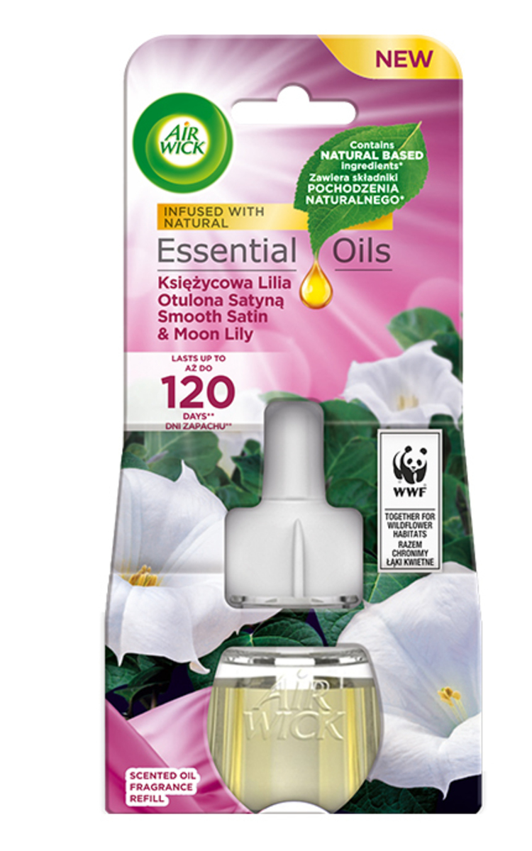 AIR WICK, elektrinio kištukinio oro gaiviklio užpildas, satino ir mėnesienos lelijų kvapo, 19 ml. 19 ml